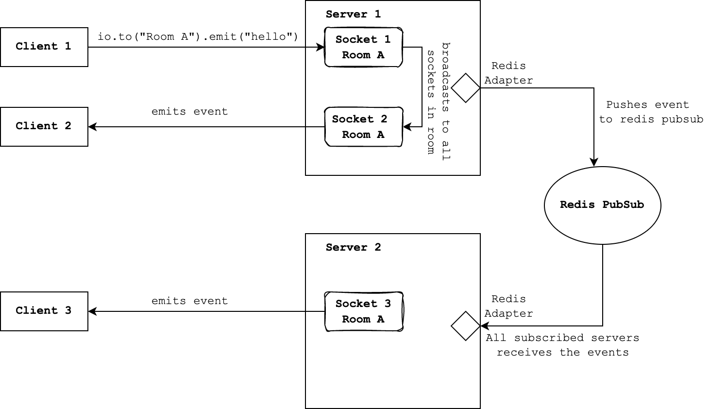 When socket 1 broadcasts messages to all sockets in Room A, the Redis adapter in Server 1 pushes this message to the Redis Pubsub channel. Since Server 2 has subscribed to this channel, it receives the message and the Redis adpater in Server 2 sends this message to all sockets in Room A in Server 2.