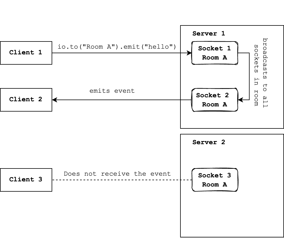 For example, consider a scenario where 3 clients connect to the server and join room Room A. Due to load balancing, Client 1 and Client 2 connect to Server 1 but Client 3 connect to Server 2. Client 1 emits a message to Server 1, io.to("RoomA").emit(), and the server broadcasts it to every client in the room socket.broadcast.to("Room A").emit(). Here only Client 2 recieves this message and Client 3 does not as it is connected to Server 2.